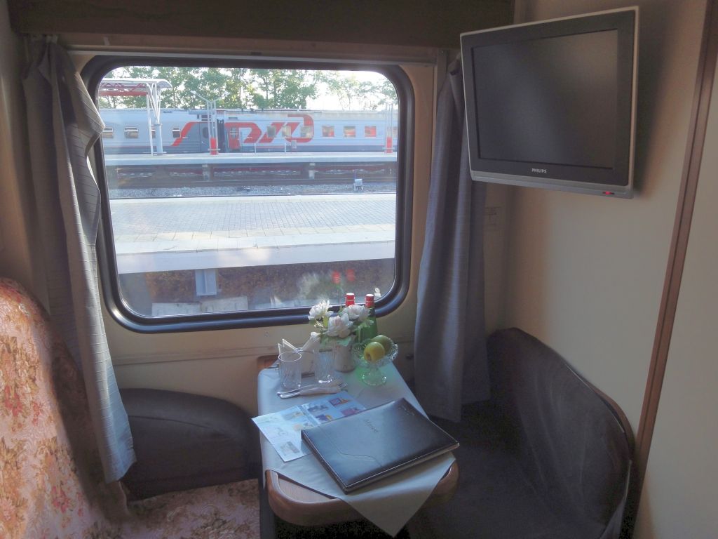 Cabin, daytime mode, menu on the table. Train 001G "Tatarstan" (Kazan' Pass. ---> Moskva-Kazanskiï). Kazan' Pass. (Kazan' 1). 19 May 2013.