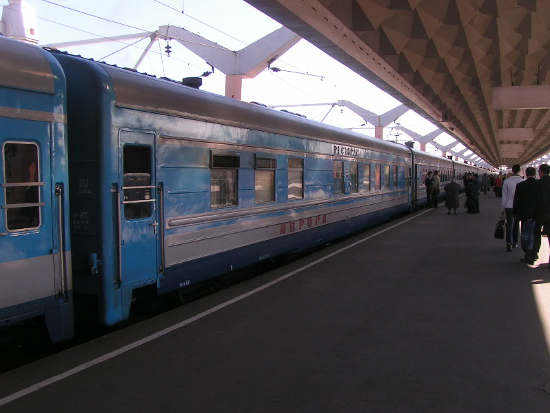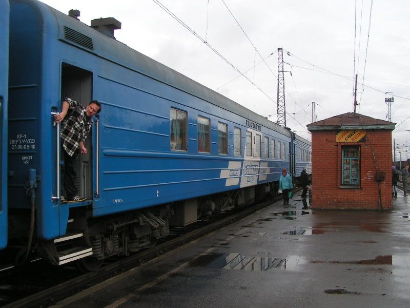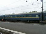 | RZD restaurant car painted in the latest colours in Ukraine's most beautiful station, Lviv. As I took these photos I was approached by two police/military guys in camouflage suits who wanted to see my passport and asked me everything about my trip and destination - spooky. 2010-05-10. |