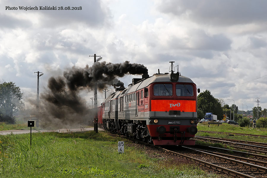 Rossijskije Zeleznyje Dorogi (RZD) 2M62-0703 with a freight train Braniewo - Mamnovo (Russia) 28.08.2018, Braniewo Photo W. Kolins |