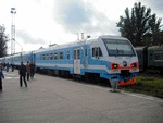New diesel-electric hybrid train DT1-002 operating as suburban express train "Pleskov" between St. Petersburg Balt and Pskov. Seen on 30 August 2009 in Pskov station.
