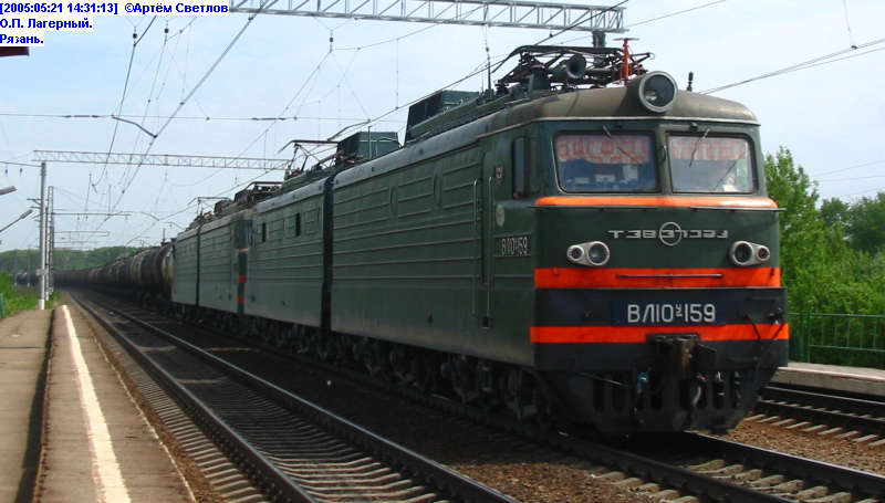 VL10u-159. Lagerniy standing point, Rjazan. Электровозы ВЛ10у-159 и ВЛ10-??? ведут двойной тягой товарный поезд в районе ОП Ляагерный, Рязань. 21.05.2005. © Artem Svetlov. trolleway @ aport.ru Electrical transport of Moscow region |