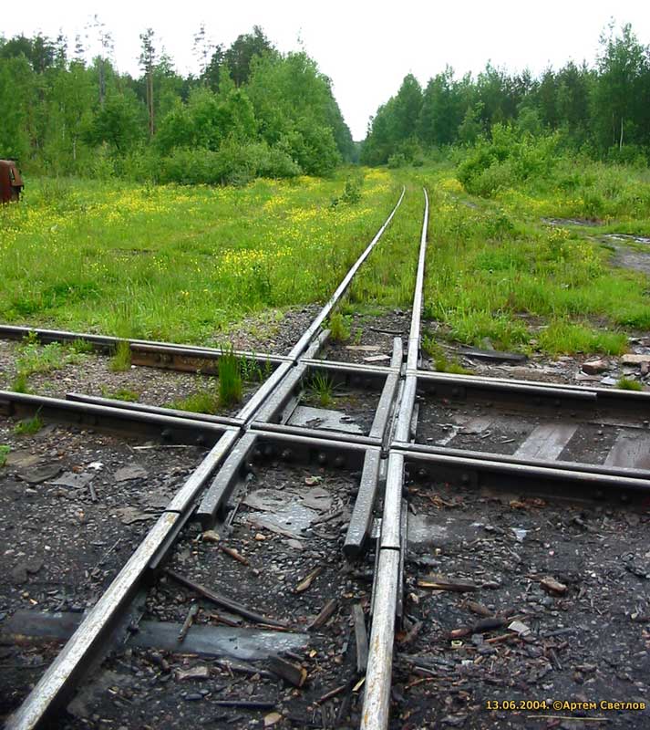 Narrow-gauged railroad of Baksheevo peat enterprise. Moscow region, near Shatura. Crossing of traks 750 and 1520 mm at Lidino siding. 13.06.2004. © Artem Svetlov trolleway@narod.ru http://trolleway.tramvaj.ru |