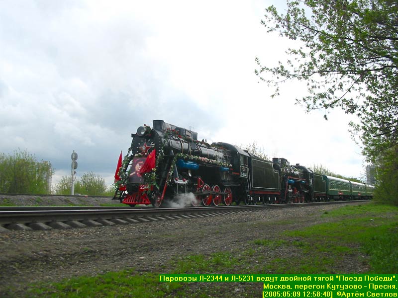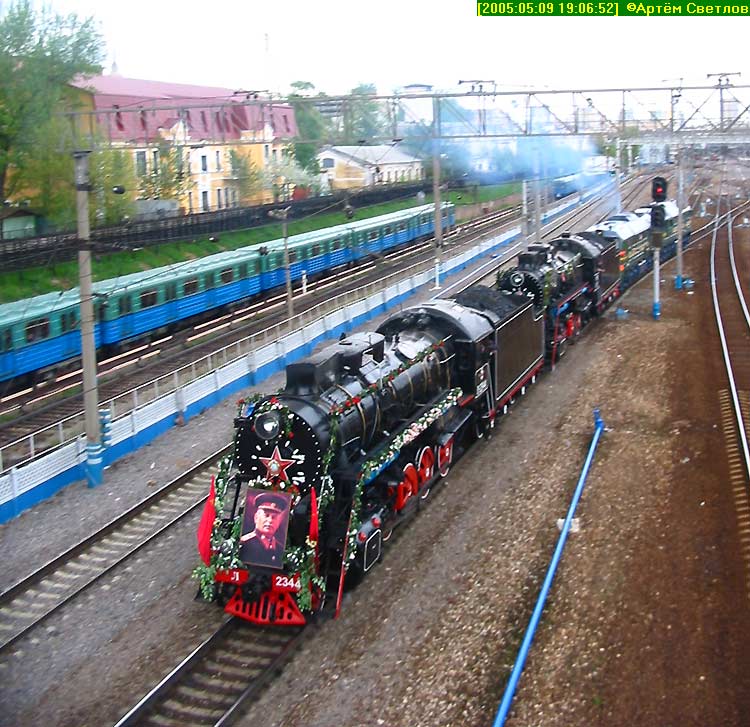 Stream locomotives L-2344+L-5231, with train for veterans. Moscow, Rizhskij terminal (station Moskva-Rizhskaja). 09.05.2005. © Artem Svetlov. trolleway @ aport.ru Electrical transport of Moscow region |