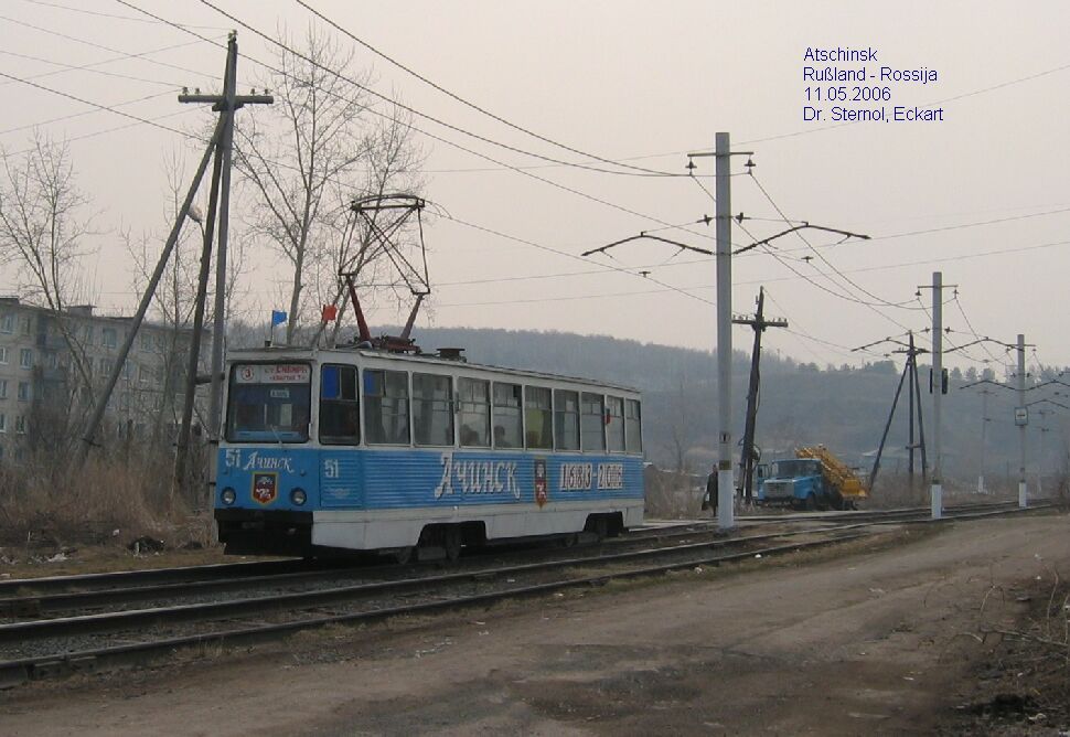 | IMG 4564 Atschinsk 11.05.06 Tram 51, Linie 3, Bj. 1981, nahe der Endstelle "kinoteatr Sibir". Atschinsk mit ca 115 000 Einwohnern hat ein Netz mit 3 Linien. Die Linien 1 und 2 verbinden die Wohngegend mit den Industriegebieten, Linie 3 verstärkt die 1 und 2 zwischen "kinoteatr Sibir" und dem Zentrum der Stadt. Dr. Sternol, Eckart (Foto), Eckart.Sternol@bahn.de |