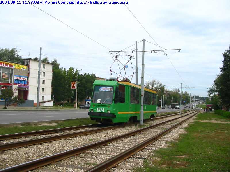 Kolomna. Tramway LM-99 (71-134K), ¹004, bulit PTMZ, St Peterburg in 2001. Route #3, Sovetskaya square. 11.09.2003. More information about Kolomna tramway - on kolomnatram.by.ru and trolleway.tramvaj.ru/tram/kolomna © Artem Svetlov. trolleway @ narod.ru, Photogallery tramcars of Moscow |