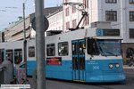| Göteborg tram No. 301 "Beda Hallberg", type M31, on line 9. 81 trams of type M21 were built 1984 to 1991 by ASEA as Bo'2'Bo', original length 22.15 m. They were rebuilt to M31 from 1998 to 2002, with new low-floor sections by MGB, new wheel arrangement Bo'1'1'Bo', new length 33 m. The width is 2.65 m, power 300 kW, speed 70 km/h, 81 seats. They are numbered from 300 to 380. 2005-08-18. |