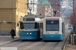 Straßenbahn Göteborg - 367 Triebwagen 367 auf Linie 4 nach Mölndal (links im Bild) und Triebwagen 447 auf Linie 3 nach Kålltorp (rechts im Bild) bei der Haltestelle Centralstationen, aufgenommen am 24. Februar 2014.