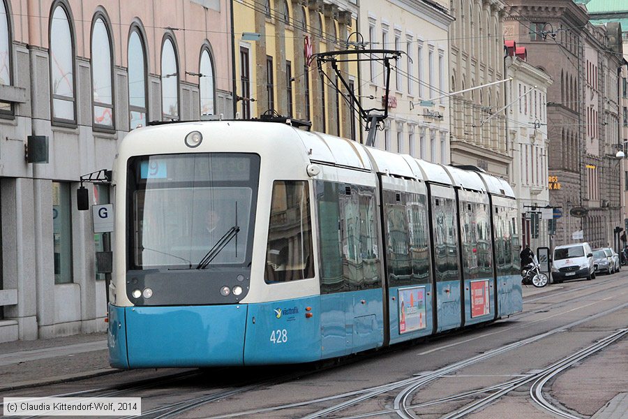 Straßenbahn Göteborg - 428 Triebwagen 428 auf Linie 9 nach Angered bei der Haltestelle Brunnsparken, aufgenommen am 24. Februar 2014.