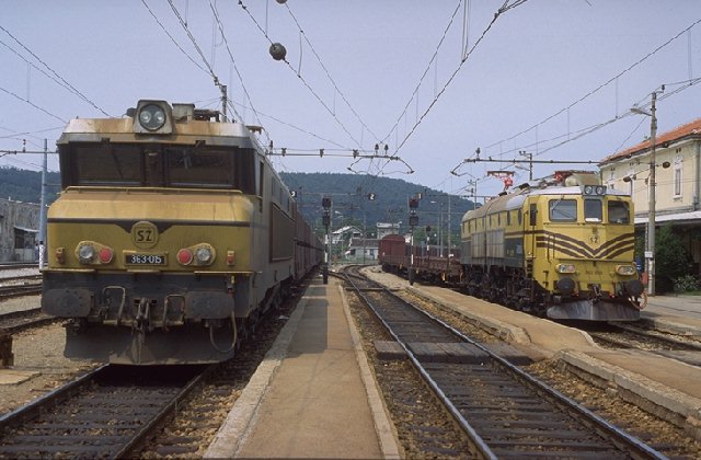 Electric loco SZ Class 363 and 362 with freight trains in the Station of Divaca (06/96) A. Canale - Italian RAilfans http://interrail.publinet.it/IRA/ |