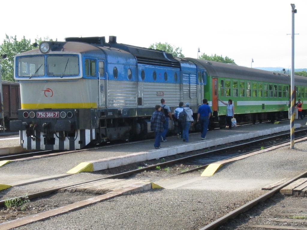 ZS 750 366-7 with passenger train to Kosice from Plesivec at Moldava nad Bodvou - before 2.2.2003 from here started passenger trains to Medzev, now on that line passenger transportation is cancelled.