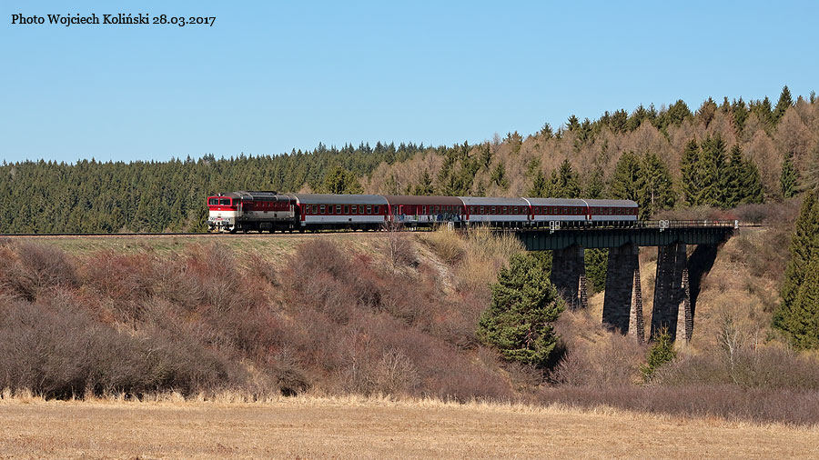 Zeleznicna spolocnost Slovensko, a.s. (ZSSK) 754 033-9 with a fast train "Odra" Banska Bystrica - Ostrava 28.03.2017, track Cremosne - Horna Stubna obec Photo W. Kolins |