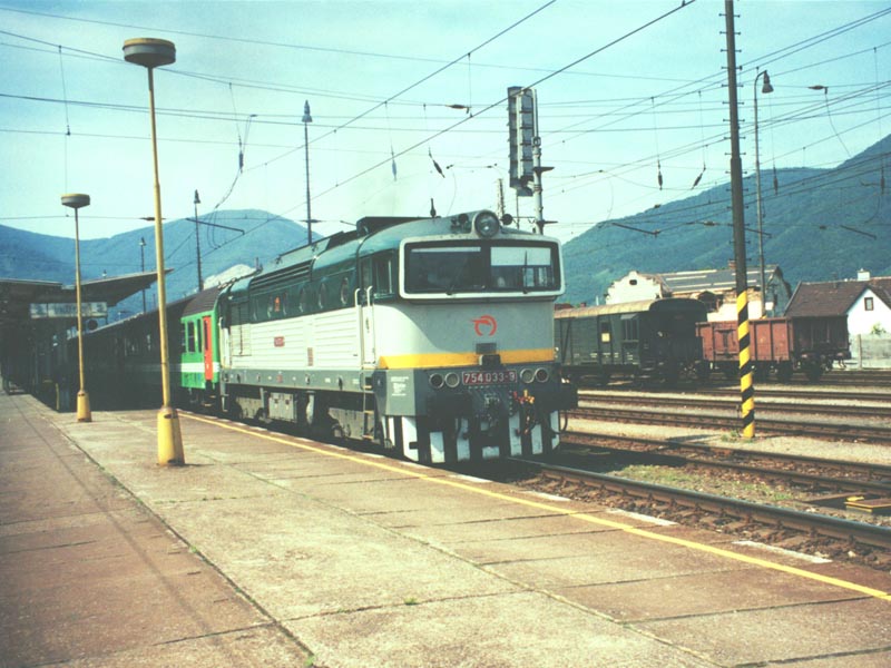 ZSSK diesel locomotive 754 035 waits with Ex 231 *Detvan* (Praha hl.n. - Zvolen os.st.) for departure
