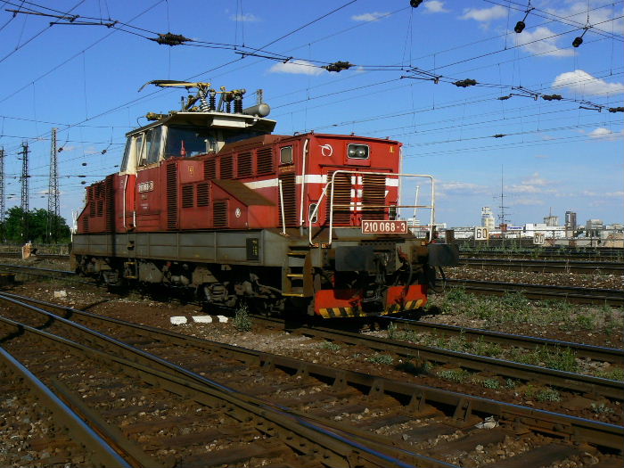 210 004-8 shunting in the marshalling yards at Bratislava Východné on Thursday April 29th, 2004. Photographed from the footbridge which runs across the complete yard.