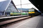 ZSR station Cadca. Two ZSSK class 162 locomotives with local trains ready to depart towards Zilina. May 2004.