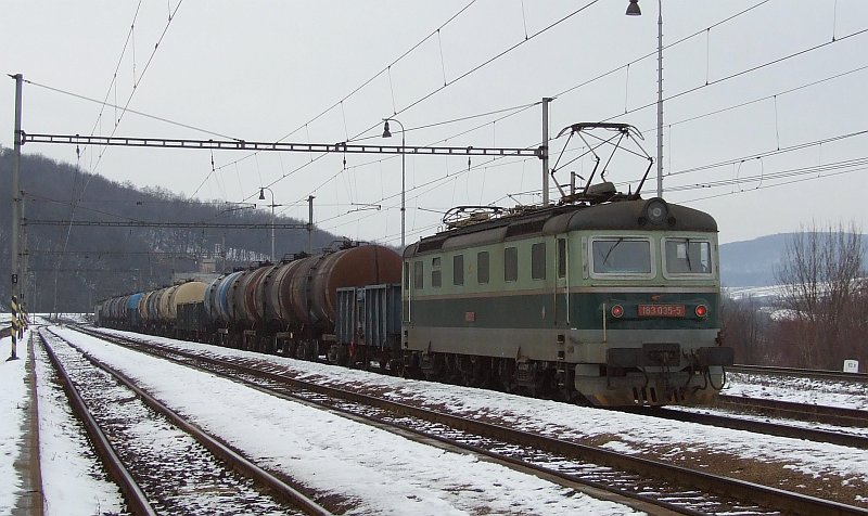 ŽSCS 183035 (DC 3 kV, 2790 kW) locomotive passing station Slanec, at the end of a freight train, as a helper locomotive, because the track has about 15 promile elevation at this portion. ŽSSK 183035 (DC 3 kV, 2790 kW) lokomotíva prechádza stanicou Slanec, na konci nákladného vlaku ako postrk, trať má totiž stúpanie okolo 15 promile na tomto úseku. ŽSSK 183035 (DC 3 kV, 2790 kW) mozdony halad át a Szalánci állomáson tehervonat végén tolómozdonyként, ugyanis a pálya emelkedése ezen a szakaszon kb. 15 ezrelék. 29. jan. 2008.