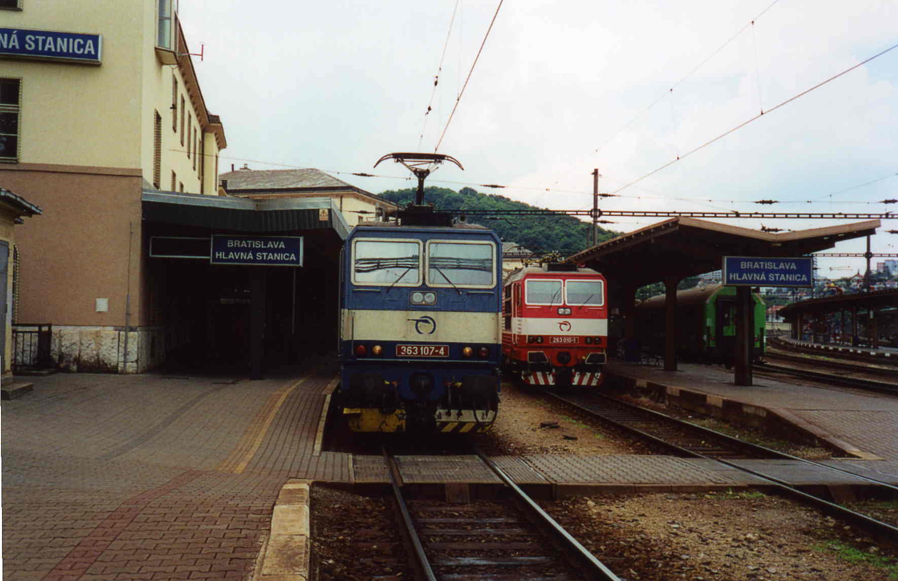 Two ZSSK locomotives, 363 107-4 and 263 010-1, at Bratislava hl. st.