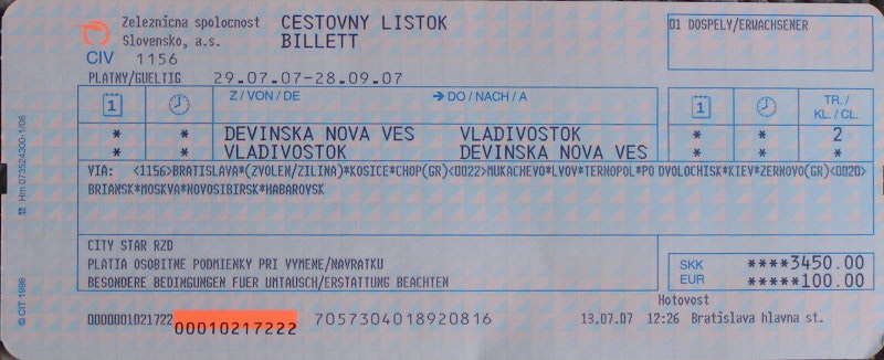 Citystar-Ticket ZSSK-UZ-RZD Devinska Nova Ves - Vladivostok and back. 1 person, 2nd class, 100 EUR.