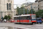 Straßenbahn Bratislava - 7114 und 7117 Triebwagen 7114 auf Linie 3 (links im Bild) und Triebwagen 7117 auf Linie 13 (rechts im Bild) am Bahnhof Bratislava Hlavná Stanica am 16. September 2008.