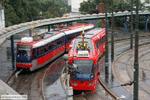 Straßenbahn Bratislava - 7101 und 7120 Triebwagen 7120 auf Linie 8 (links im Bild) und Triebwagen 7101 auf Linie 13 (rechts im Bild) am Bahnhof Bratislava Hlavná Stanica am 16. September 2008.