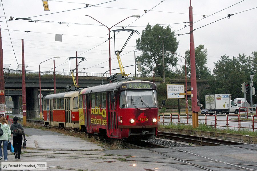Straßenbahn Bratislava - 7843 Triebwagen 7843 auf Linie 8 an der Haltestelle beim Bahnhof Bratislava Vinohrady am 16. September 2008.