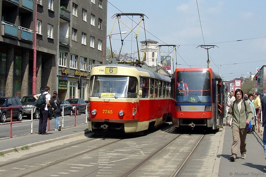 Bratislava Tram. Tatra T3SUCS 7745 approaches Trnavské mýto with an eastbound number 6 to Staré Mesto on Thursday April 28th, 2004.