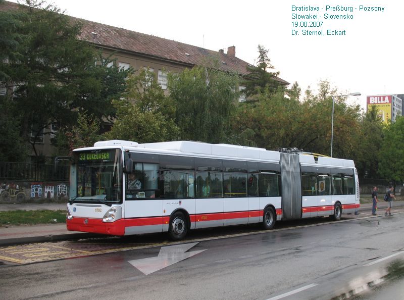 | IMG 8121 Preßburg 19.08.07 O-Bus 6702, Linie 33, an der Endstelle Molecova. Die O-Busse sind auf ihre Hilfsdieselmotoren angewiesen, denn Linie 33 ist nicht mit dem übrigen O-Busnetz verbunden. Außerdem ist die Wendeschleife ohne Oberleitung, da das Planfeststellungsverfahren dafür noch nicht so umgesetzt werden konnte, wie das gedacht war. Dr. Sternol, Eckart |