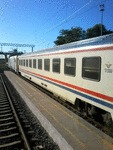 A passenger car "WSPlm" of TCDD ( Turkiye Cumhuriyeti Devlet Demiryollari / Turkish Railways ) standing at railway station HalkalI in composition of Ankara Ekspresi to Ankara.
