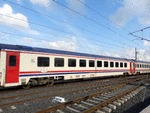 A passenger car type "WSPlm" of TCDD (Turkiye Cumhuriyeti Devlet Demiryollari / Turkish Railways ) standing at railway station Ankara in composition of train "Izmir Mavi Treni" to Izmir (Basmane).A video movie about departuring the train you can see on this adress: