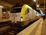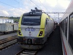 An electric locomotive E68 038 of TCDD ( Turkiye Cumhuriyeti Devlet Demiryollari / Turkish Railways ) at railway station Istanbul HalkalI with International train "Istanbul Sofya Ekspresi" with number 12502 / 492 to Sofia.