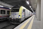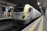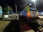 An electric locomotive of class 68 of TCDD ( Turkiye Cumhuriyeti Devlet Demiryollari / Turkish Railways ) "Trakya" with number E 68 023 standing at railway station Istanbul HalkalI with International train with number 492 / 494 / 81032 to Sofia.