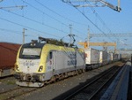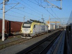 An electric locomotive E68 048 of TCDD ( Turkiye Cumhuriyeti Devlet Demiryollari / Turkish Railways ) at railway station Catalca with freight train.