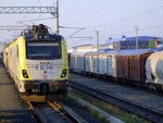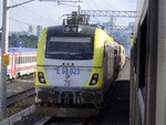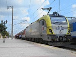 A view between 2 electric locomotives of class 68 , both owned by TCDD ( Turkiye Cumhuriyeti Devlet Demiryollari / Turkish Railways ) "Trakya" , standing at railway station Istanbul HalkalI with passenger trains.My impression about visiting that European part of Turkey , you can see on this adress: