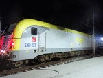 An electric locomotive of TCDD (Turkiye Cumhuriyeti Devlet Demiryollari / Turkish Railways ) "Trakya" with number E 68 023 staning at railway station Edirne with International train with number 1496 to Plovdiv.
