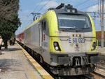 An electric locomotive of class 68 of TCDD ( Turkiye Cumhuriyeti Devlet Demiryollari / Turkish Railways ) "Trakya" with number E 68 023 standing at railway station KapIkule (border railway station between Turkey and Bulgaria) with International train with number 492 / 494 / 81032 from Istanbul HalkalI to Sofia.