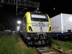 An electric locomotive of class 68 of TCDD ( Turkiye Cumhuriyeti Devlet Demiryollari / Turkish Railways ) "Trakya" with number E 68 048 standing at railway station KapIkule (border railway station between Turkey and Bulgaria) after pulling a train with number 12702 from Istanbul HalkalI.