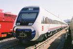 An EMU CAF , owned by TCDD (Turkiye Cumhuriyeti Devlet Demiryollari / Turkish Railways ) at railway station Istanbul Sogutlucesme , using a YHT train.