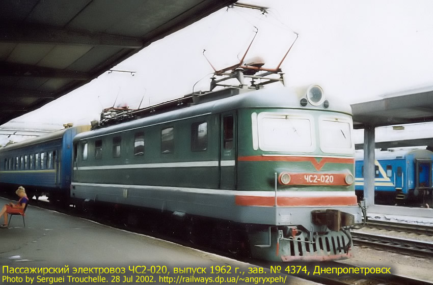 Electric Locomotive ChS2 (ЧС2) 020 in Dniepropetrovsk, Ukraine, Jul 28, 2002 Photo by Serguei Trouchelle (stro@railways.dp.ua), http://railways.dp.ua/~angryxpeh/ |