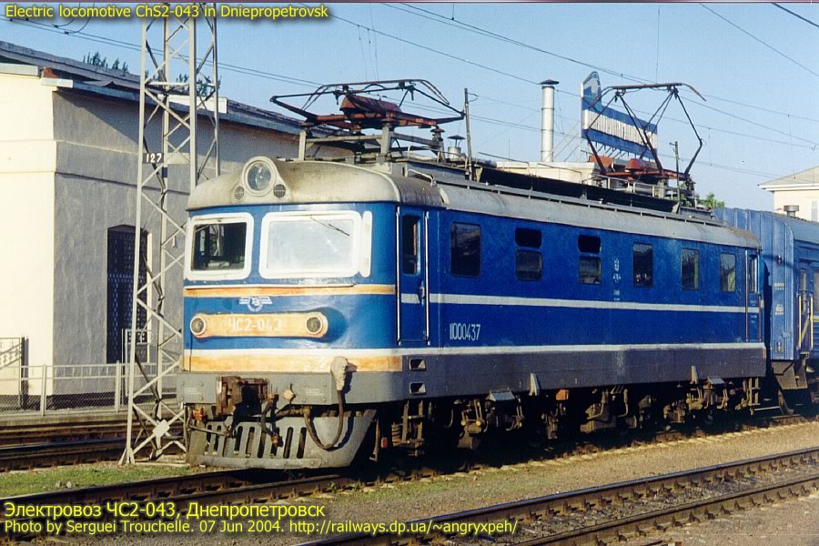 Electric Locomotive ChS2 (ЧС2) 043 in Dniepropetrovsk, Ukraine. Jun 07, 2004 Photo by Serguei Trouchelle (stro@railways.dp.ua). http://railways.dp.ua/~angryxpeh/ |