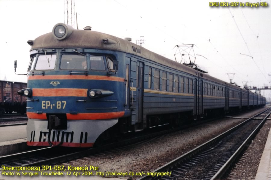 EMU ER1 (ЭР1) 087 in Kryvyi Rih, Ukraine. Apr 12, 2004 Photo by Serguei Trouchelle (stro@railways.dp.ua). http://railways.dp.ua/~angryxpeh/ |