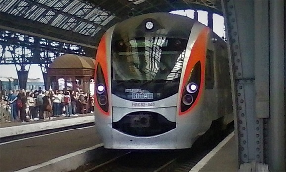 An EMU HRCS2 , built by "Hyundai-Rotem" of UZ (Ukraine Zaliznyza / Ukrainian Railways) , standing in railway station Kiew pass. , using a fast train from Lviv.