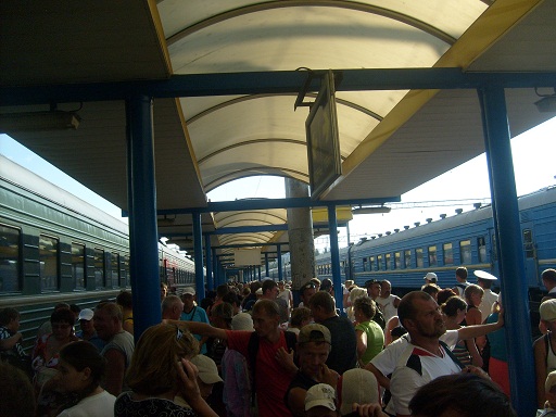 Crowd at Simferopol station.The train on the left is a Sevastopol-St. Petersburg train. 19.08.2010