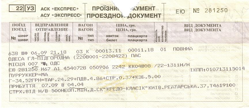 UZ-ticket Odessa-Pidhorodna for train 638 6.9.2006
