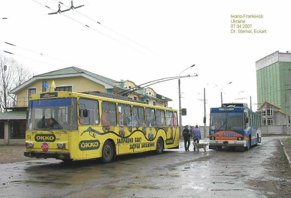 | IMG 6142 Iwano-Frankiwsk 07.04.07 O-Bus 174, Linie 2, vor einem Motel an der Endstelle Presmasch. Rechts pausiert Wagen 168. Dr. Sternol, Eckart (Foto) |
