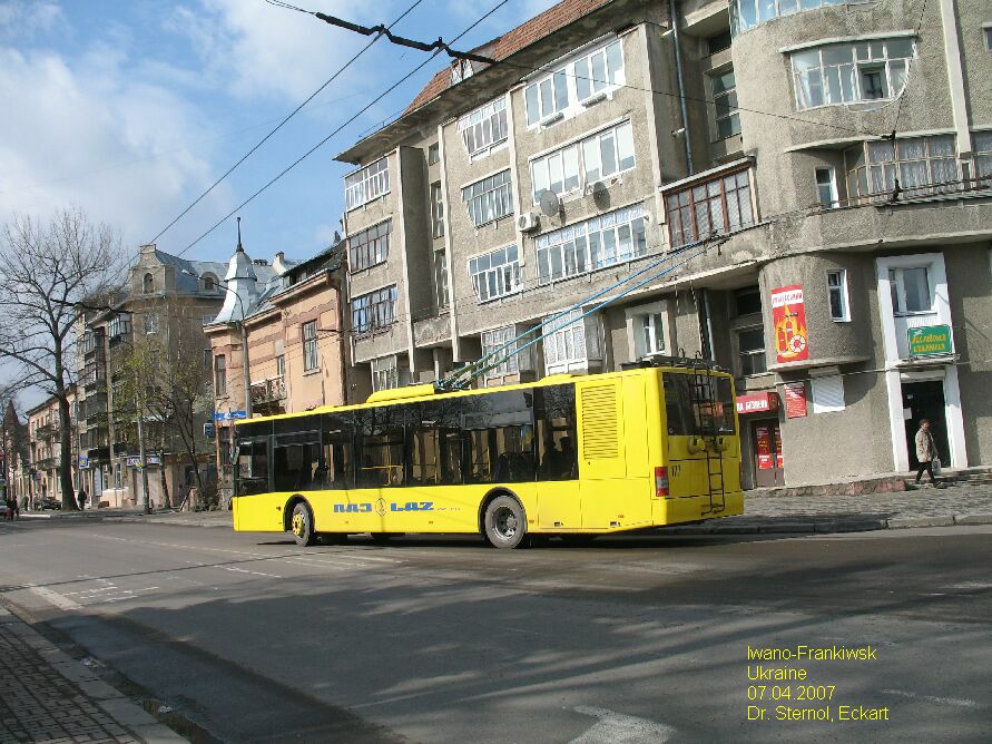 | IMG 6163 Iwano-Frankiwsk 07.04.07 O-Bus 154, Linie 2, begibt sich am Bahnhof auf die Fahrt in Richtung Presmasch. Dr. Sternol, Eckart (Foto) |