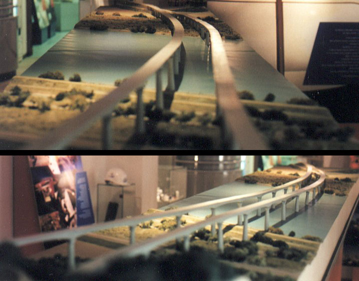 A model of the twin bridges at Avignon, where the LGV Méditerranée high speed line splits into two branches going to Montpellier and Marseille. Two of the legs of the the "Triangle des Angles" cross the Rhône river, with two tracks each, on the Viaduc des Angles bridges. June 1997 photo. Photo by Yann Nottara (ynottara@mail.dotcom.fr) |