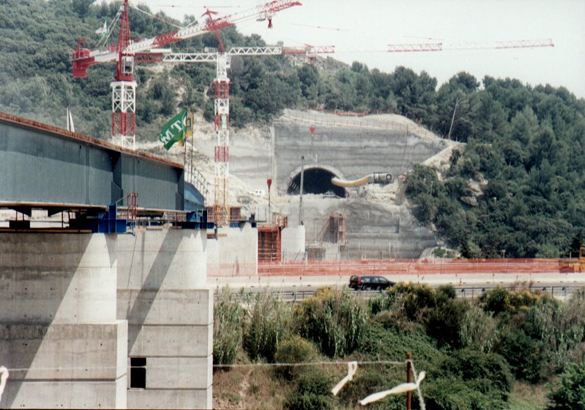 Another view of construction on the Ventabren bridge. This bridge crosses a highway; in order not to close the busy highway during construction, the bridge section shown here was built parallel to it. Later it was pivoted into its final position across the highway. June 1997 photo. Photo by Yann Nottara (ynottara@mail.dotcom.fr) |
