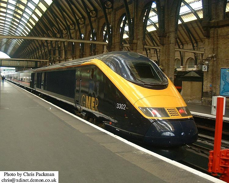 A former north of London Eurostar (3300 series) now leased by British rail operator Great North Eastern Railway (GNER). This Eurostar never sees service through the channel tunnel or on high speed lines. The GNER livery has been applied to the trainset using removable adhesive wrap. May 2000. Photo by Chris Packman (chris@xdinet.demon.co.uk) |
