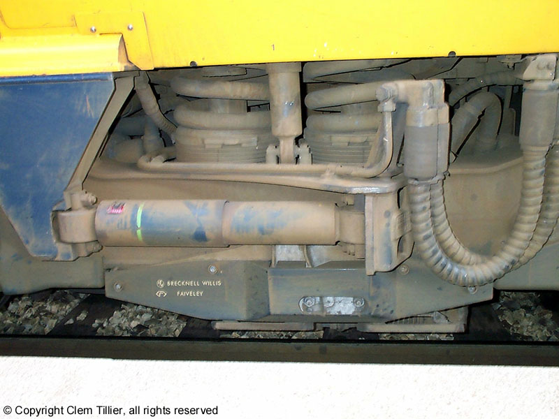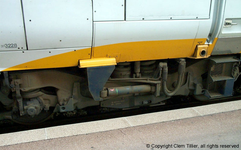 Bogie of power car 373228 showing 750V third rail pickup shoe. |