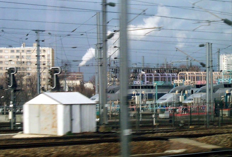 A small portion of the Landy TGV maintenance shops just north of Paris, snapped from inside a passing RER train. Colored structures around three TGV Réseau trainsets are inspection gantries. January 2000. Photo by Clem Tillier (ctillier@alumni.princeton.edu) |