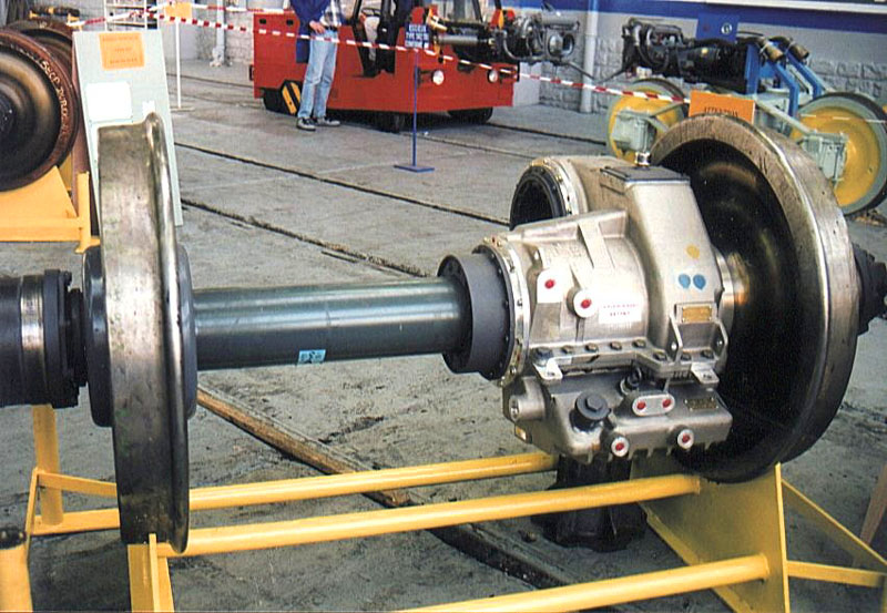 This is a truck (bogie) used on the TGV Duplex power cars. The gear reduction stage on the axle is clearly visible; the tripod shaft would fit in its round opening. A similar stage is attached to the other axle but hidden in the photo by suspension springs. Also visible in the very foreground is the brake cylinder for the cheek-mounted disk brake present on the wheel closest to the viewer, as well as that furthest (the disk is actually visible in the rear). Photo source: Railway-Technology.com |